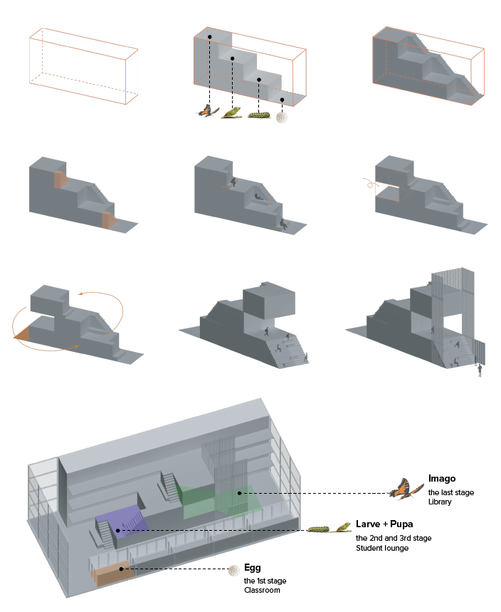 In the initial stage, represented by an egg composed of numerous hexagonal shapes, C2C plane hexagon carpet tiles by Shaw Contract are used in the classrooms. The design of built-in bookshelves and lighting fixtures in the student lounge takes inspiration from the forms of larva and pupa. Finally, the wall partitions in the open library and presentation area feature simplified, abstract butterfly patterns, symbolizing the final stage of metamorphosis.